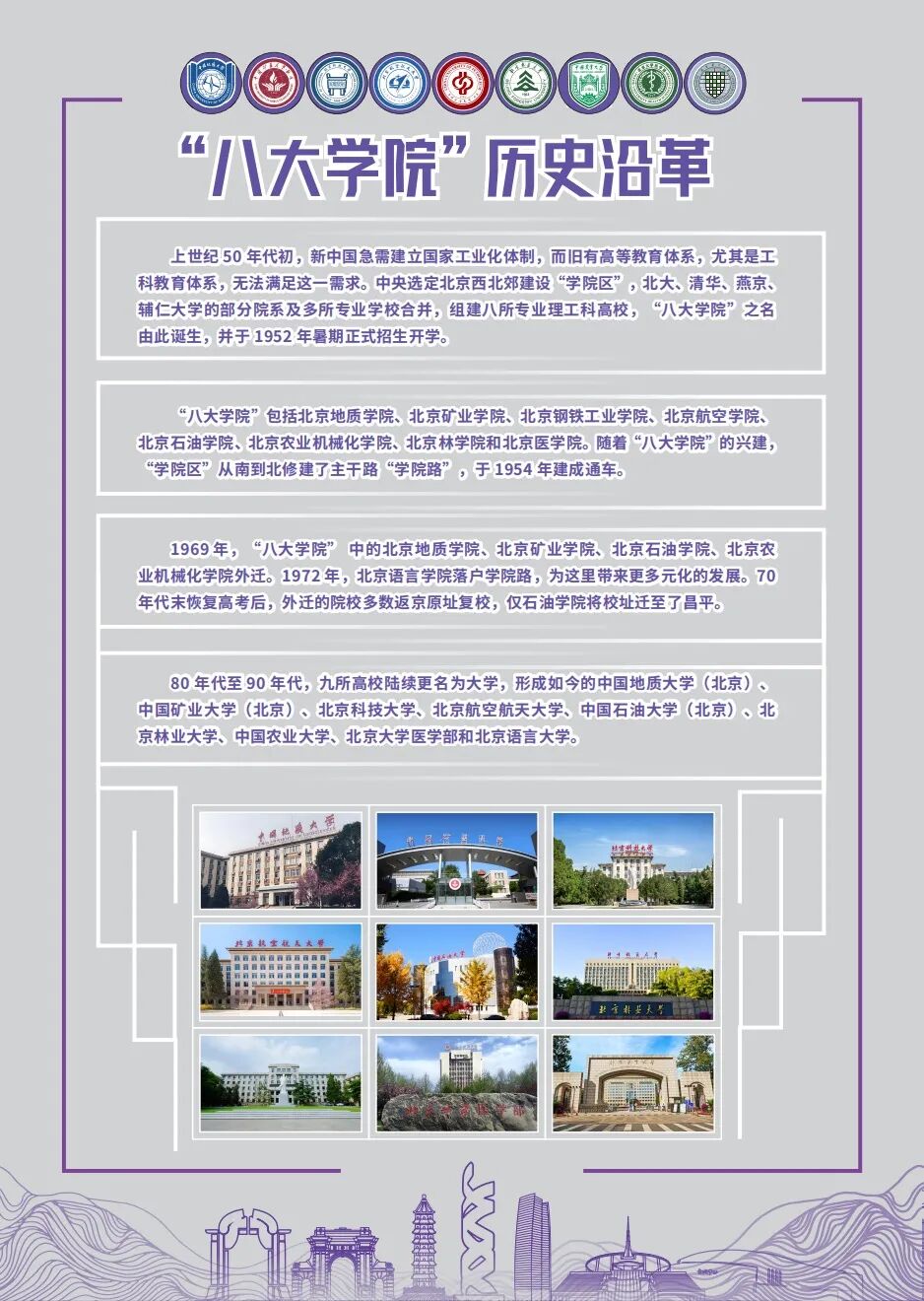 1952年,在当时还是一片荒芜的庄稼地上,“八大学院”的校舍相继破土动工,沿规划中的学院路两侧分布,由南向北依次排开:东侧从南到北为“北京医学院”“北京钢铁工业学院”“北京石油学院”“北京农业机械化学院”;西侧从南到北为“北京航空学院”“北京地质学院”“北京矿业学院”“北京林学院”——这便是最早的“八大学院”。1954年底,南起蓟门桥、北至清华东路,全长5.59公里的学院路建成通车,为“八大学院”的发展搭建起重要框架。